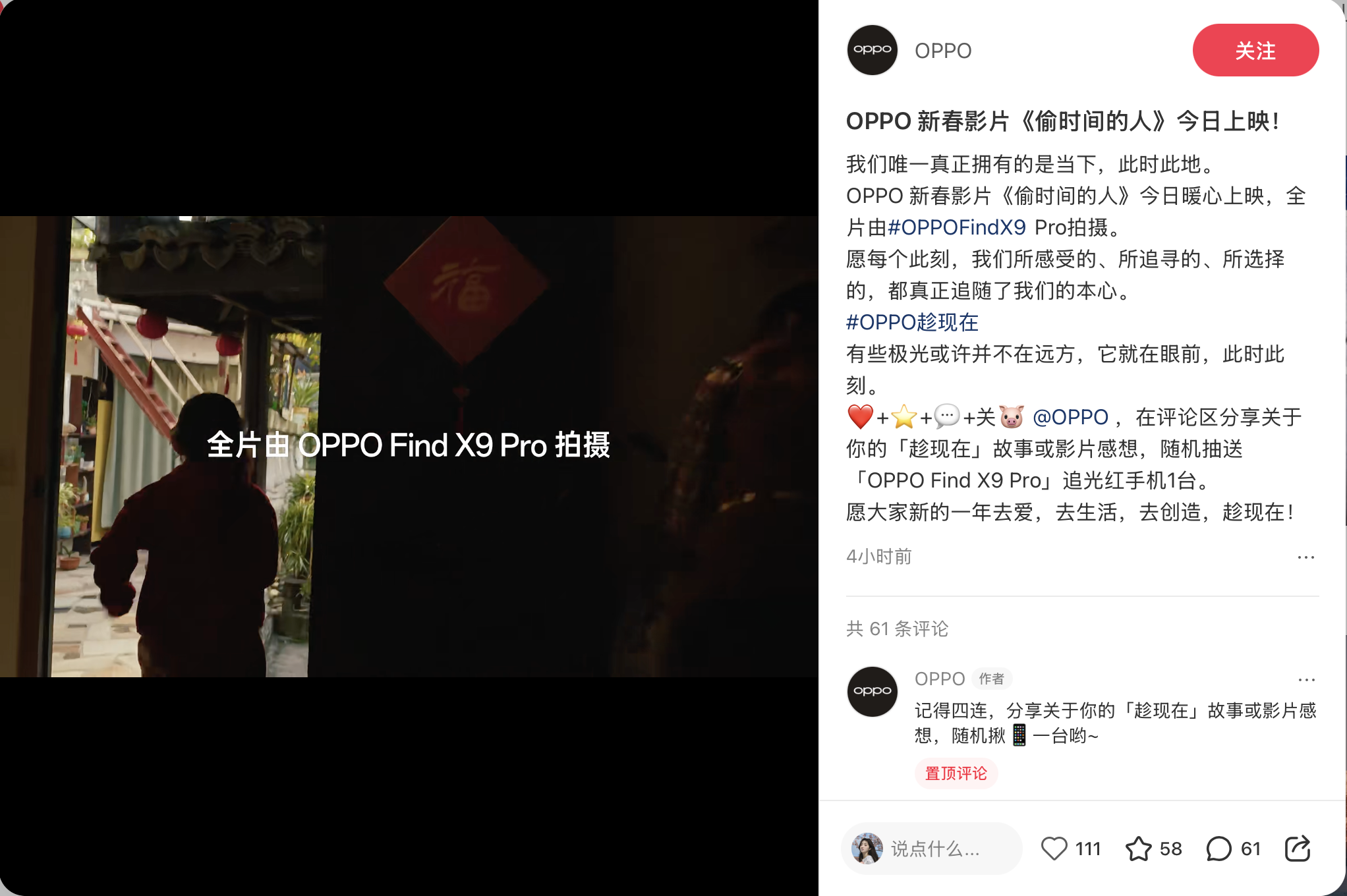 这部影片主要讲述在大城市工作的主角况悠过年回家依旧忙于工作,无法兼顾大城市快节奏的工作和照顾家乡年迈的父母,通过借用“偷时间”这一隐喻,讲述况悠试图追回珍惜的时光,「偷」了金鱼、小猫、面点摊的馒头还有小船的时间,而在小镇掀起波澜,最终走向自我觉醒、回归当下的内心旅程。影片提醒我们:即便工作再忙,也别忘了陪伴难得的家人,用手机,留存那些平凡却温暖的日常片刻。OPPO强调,我们唯一真正拥有的是当下,此时此地。愿每个此刻我们所感受的、所追寻的、所选择的,都真正追随了我们的本心。